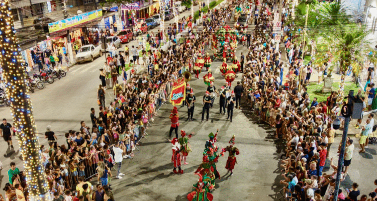 O desfile começou com a alegria contagiante da Trupe Natalina, que percorreu a avenida interagindo com o público e preparando o cenário para as atrações que se seguiram. Entre os destaques estava o luxuoso bloco Natal Dourado, que apresentou trajes sofisticados e brilhantes, representando o glamour das festas natalinas.